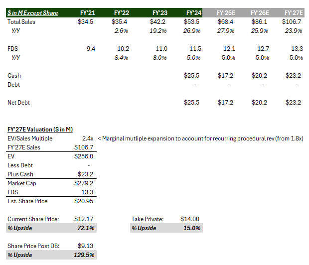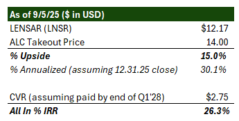 If we look at the math to value this company on FY’27E sales with a $10M break-fee going to LNSR should the deal terminate, we’re left with some impressive return projections.