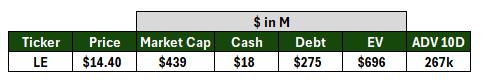 Like GES, Lands’ End (LE) is also in play after Eddie Lampert (majority stockholder) pushed the board in February to start a strategic review to unlock unrecognized value. In his mind, he thinks it’s worth $90 at fair value → lol.