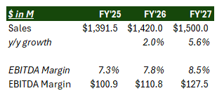 Y/Y sales growth inflecting, and recent earnings point to an increase in adj. EBITDA is expected to be between $95 - $107 million, vs $93 million in FY’24.
