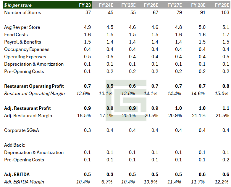 This all makes sense given the small J-curve associated with restaurant openings until normalized AUV can be reached. Looking at my below model, I’ve factored in aggregate sales ramp for new units on top of existing ones while understanding margins will compress in the near term.