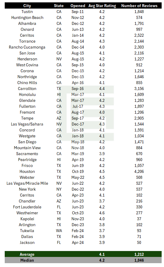 On average, the restaurants have a 4.1 rating and a thousand reviews. While the newer locations are ramping up, many of the complaints come from guests not being able to order food as quickly since there is a limit per “order” that a guest can make at one time.