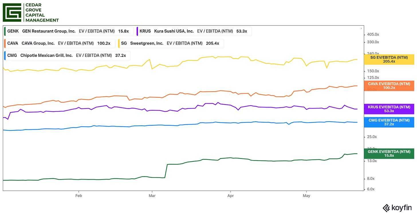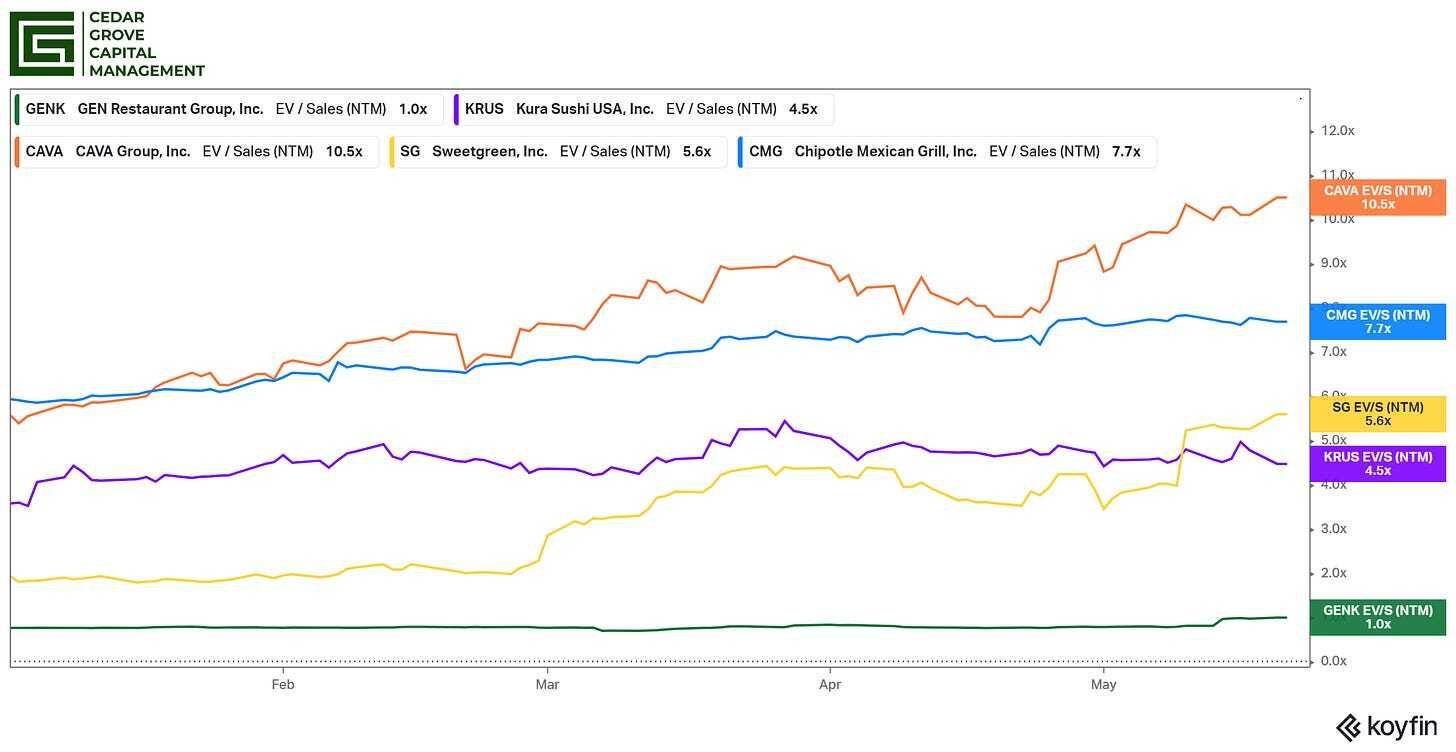 The valuation of GENK is a tough one. It’s small enough that it lies under the radar of many funds and investors but not too small that it wouldn’t pique the interest of others who have found success in other restaurant concepts.