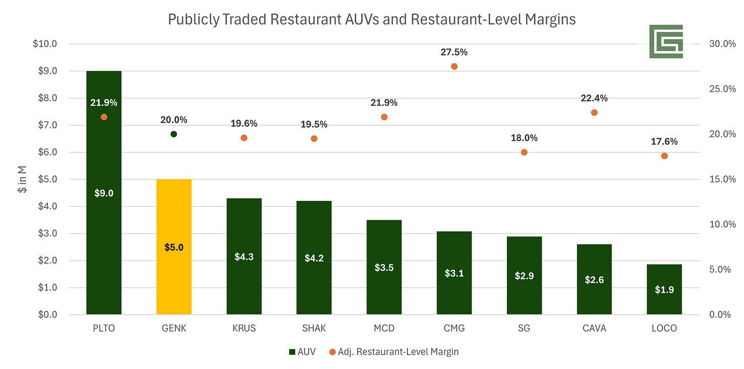 This is in contrast to GENK’s unit economics, which as of the most recent quarter, were $5.8 million in AUV and 16.6% adjusted restaurant-level EBITDA margins. But don’t let what I just said confuse you with what you’re seeing above. As GENK is ramping up its unit growth, new units in new markets will both a) bring down AUV and, b) potentially expand margins at scale.