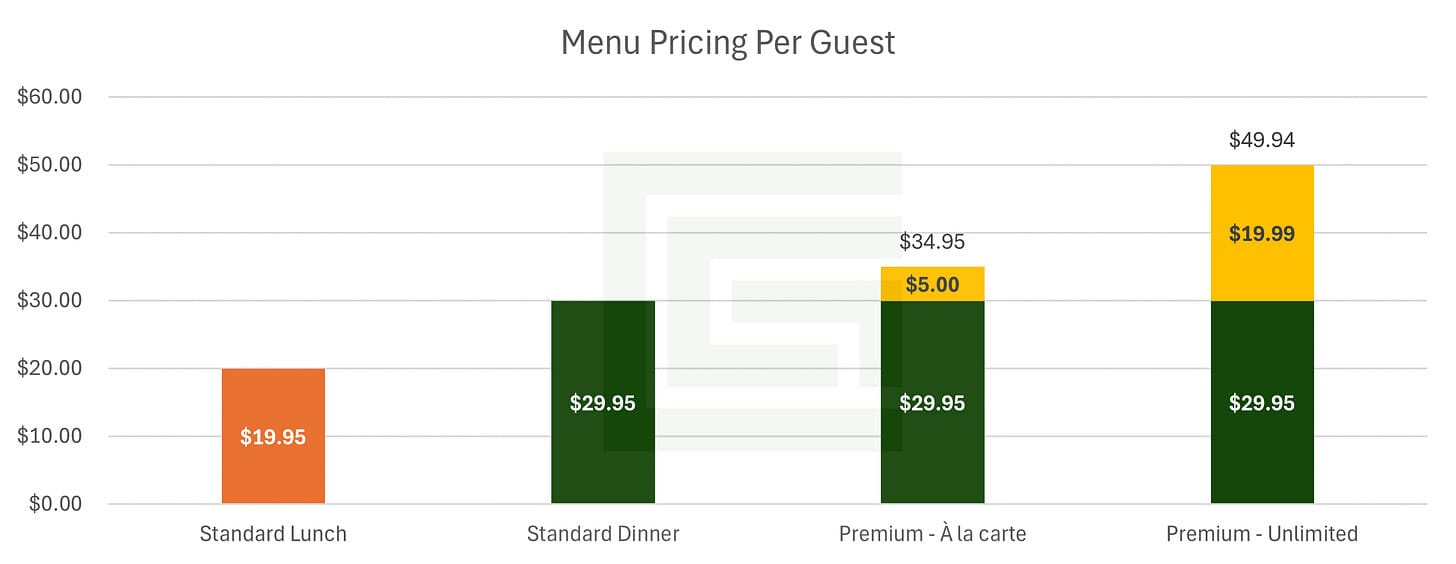 Take the above as an example. Standard lunch pricing starts at $19.95 and dinner at $29.95. In addition to this, the “premium” menu can be ordered for $1 - $2 per option per guest. Assuming each guest gets a few things, I’ve figured this could be an additional $5 in a la carte ordering.