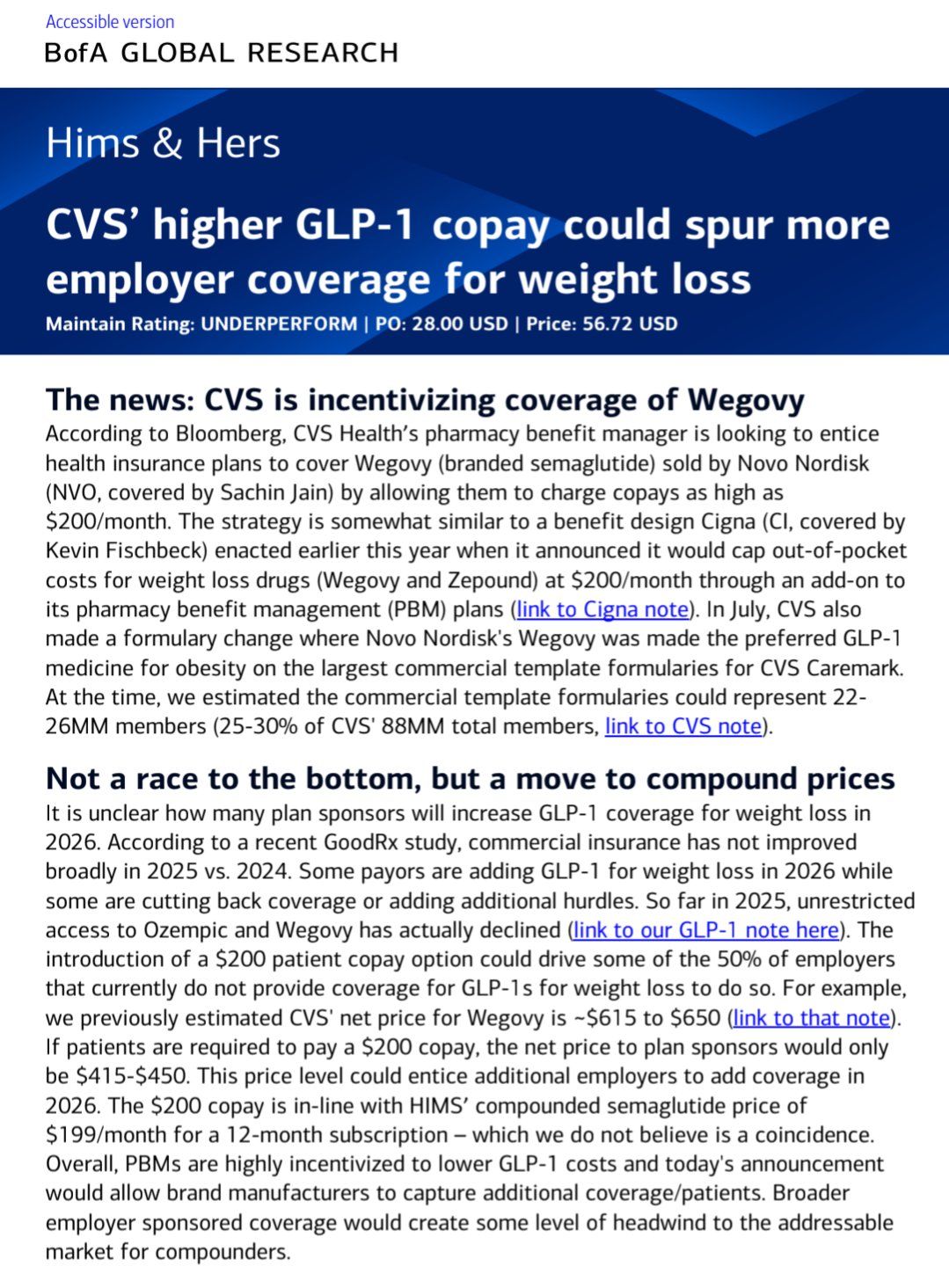 BofA noted that the price CVS is looking for, on par with HIMS $199/mo price (at an annual subscription), is not a coincidence. They believe that if this were adopted, it could drive some of the 50% of employers who don’t currently offer coverage to begin doing so.
