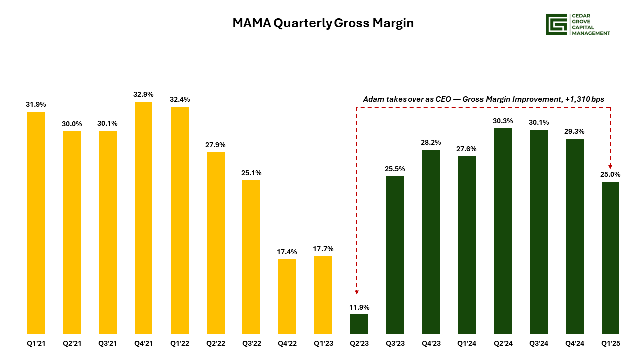 Prior to Adam taking over, sales were still growing but margin improvement below the line was lackluster and FCF generation was failing to impress. Adam comes in the summer of 2022 with an emphasis on improving operational efficiencies and setting up the future of what MAMA will be.