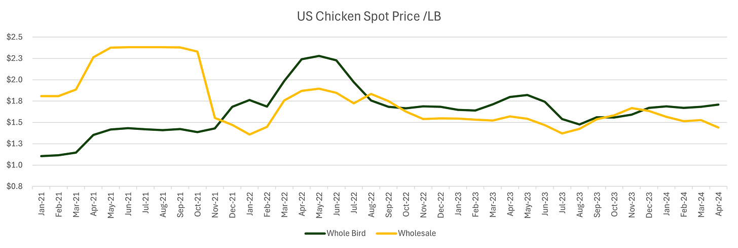 Right now, given the bird flu outbreak causing havoc since the end of 2023, millions of birds across states have been put down in order to contain the spread.1 This had an impact on prices which explains why MAMA has been seeing pressure.
