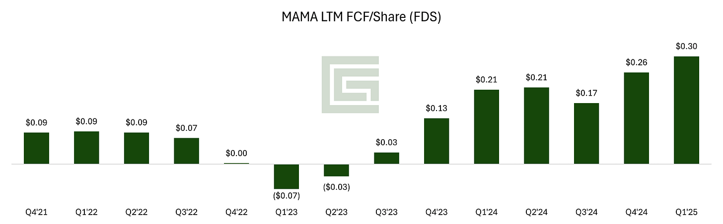 If you’ve been following the story, you’d know that there is no surprise that under the helm of Adam Michaels (CEO), MAMA has been able to grow topline 11%/quarter for the last 10 quarters and improve LTM FCF/share by 10x over the last 7 quarters.