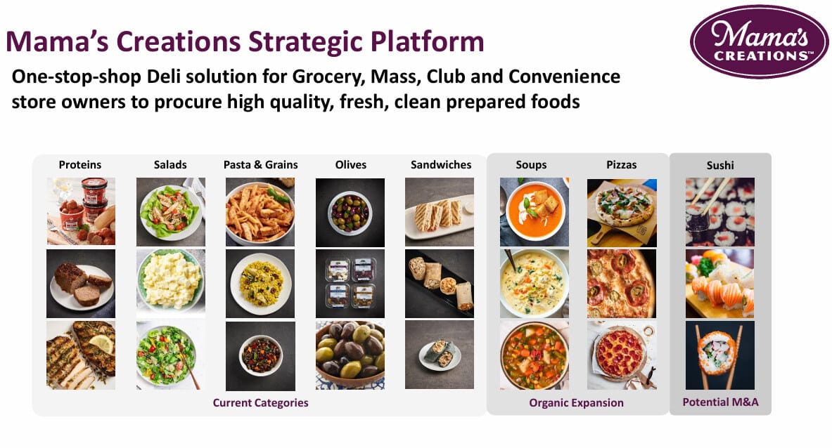 Mama’s Creations, formally known as Mama Mancini’s, is a marketer and manufacturer of fresh deli-prepared foods that can be found in over 8,400 grocery, mass, club, and convenience store locations across the U.S.