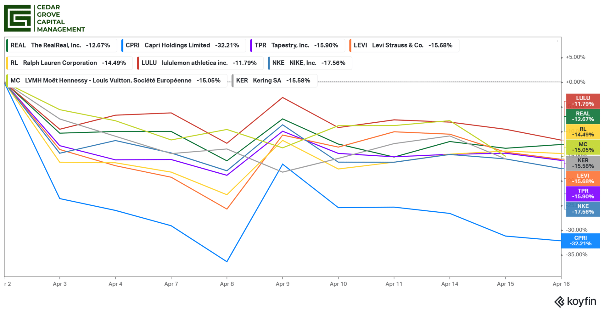 But the problem here is that ALL companies listed above, outside TRR, should have been hit by the announcement of tariffs. Having supply chain exposure to Asia is obviously a bad thing, and for the European brands, needing to import from the EU also has its negative tariff implications.