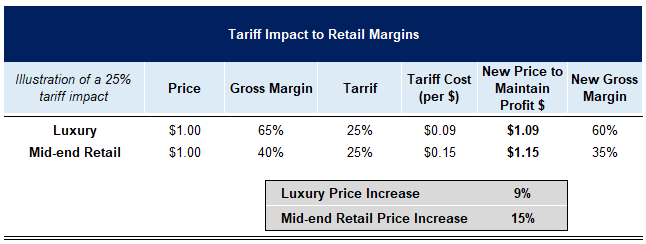 Pulling a helpful chart when it comes to a hypothetical tariff exercise, luxury brands are naturally better insulated on their margins than mid-end retailers, as you can see below.